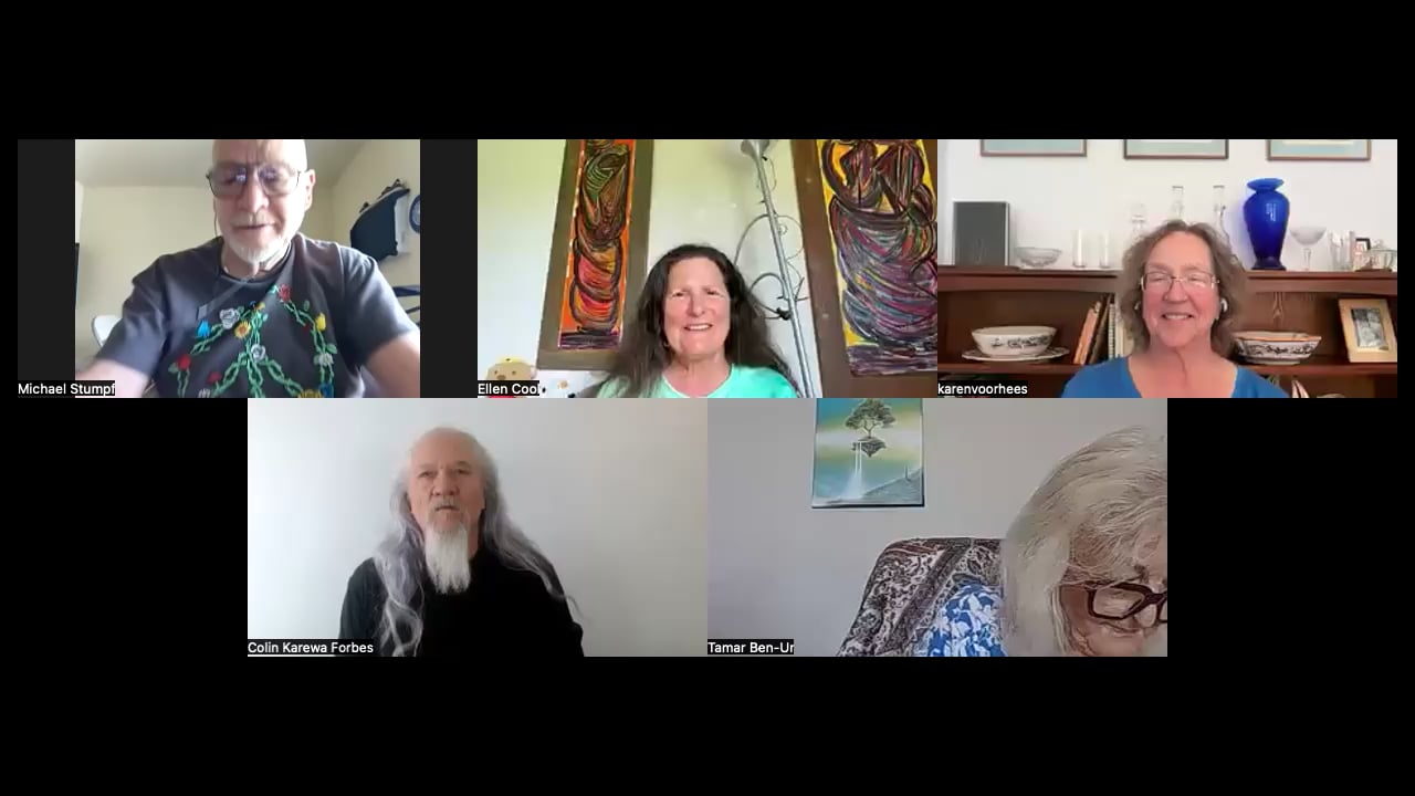 A small circle gathered: Colin Karewa Forbes, Ellen Cool, Karen Voorhees, Michael Stumpf, and Tamar Ben-Ur. Marco was there too, silently, his audio frozen — which the group took as a synchronicity and ran with.
